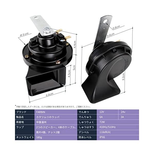 【製品パラメータ】:ていかくでんあつ:12V、ていかくでんりゅう:3A×2、周波数:Hi 510Hz &Low 410Hz、音圧:118±5dB、パッケージ重量:約600g、梱包サイズ:180.0×110.0×80.0mm。