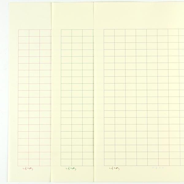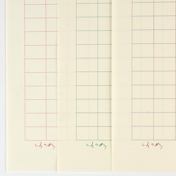 満寿屋さんのクリーム紙の上に優しいピンクや緑、茶のインク、そしてもちろんしろつめのロゴが入っています。200字詰めの原稿用紙として、また普段使いの便箋として、皆さまのペンがなめらかに滑ることを想像しただけで嬉しくなっていまいます。 (ルビ無し)