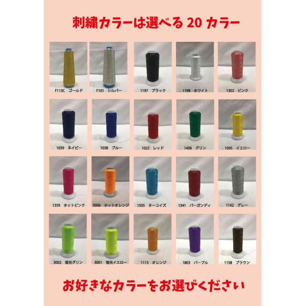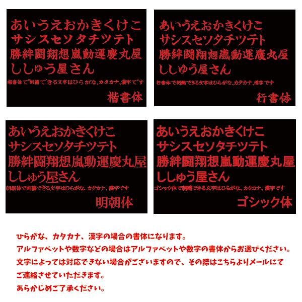 6文字以上の刺繍の場合、別途¥100(税込)、両面への刺繍の場合、別途¥200(税込)、2行にわたって刺繍の場合は別途¥200(税込)頂戴いたします。あらかじめご了承ください。