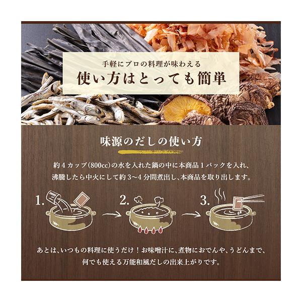 お召し上がり方 約4カップの水を入れたお鍋の中に、本品を1パック入れます。沸騰したら中火にして約3〜4分間煮出し、本商品は取り除きます。(料理ごとにだしの分量は加減して下さい。)