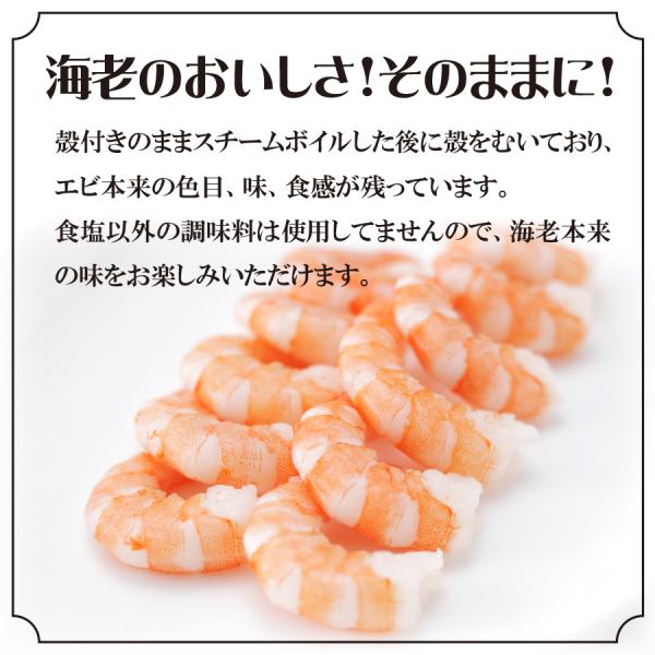 殻付きのままスチームボイルした後に殻をむいており、エビ本来の色目、味、食感が残っています。
