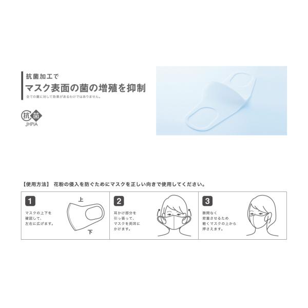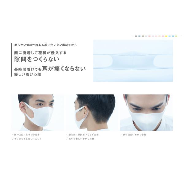 柔らかい伸縮性のある素材だから顔に密着して花粉が侵入する隙間をつくらず、さらに、長時間着けても耳が痛くならない!