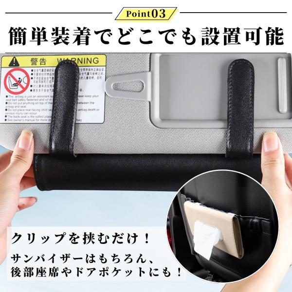 ●クリップを挟むだけなので、サンバイザー・シートバック・ドアポケットなど好きな場所に簡単取付