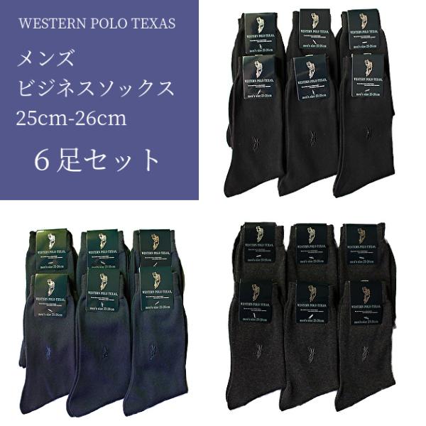 【6足セット】メンズ 靴下 ビジネス ソックス 綿混 WESTERN POLO ワンポイント刺繍 平編み ウエスタンポロ 黒 紺 チャコールグレー