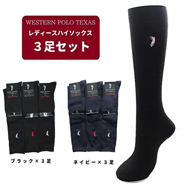 【3足セット】レディース ハイソックス リブ スクール用 WESTERN POLO ウエスタンポロ 刺繍入り 靴下 黒 紺 ブラック ネイビー