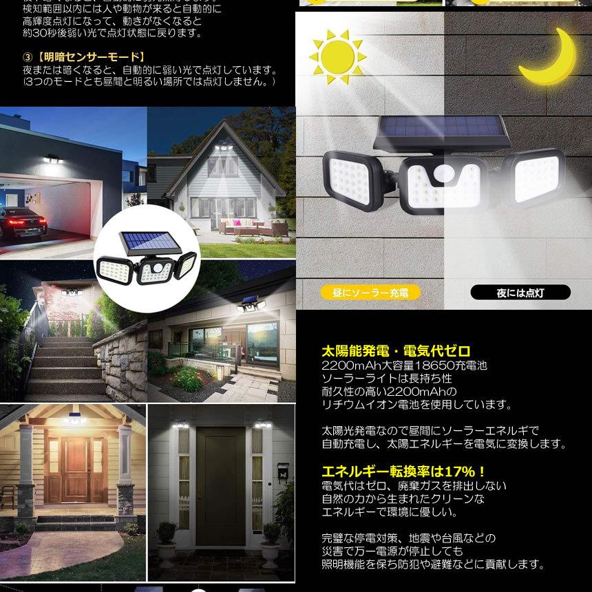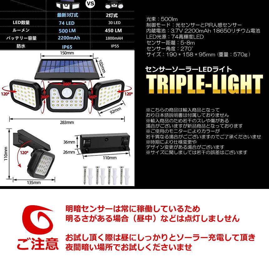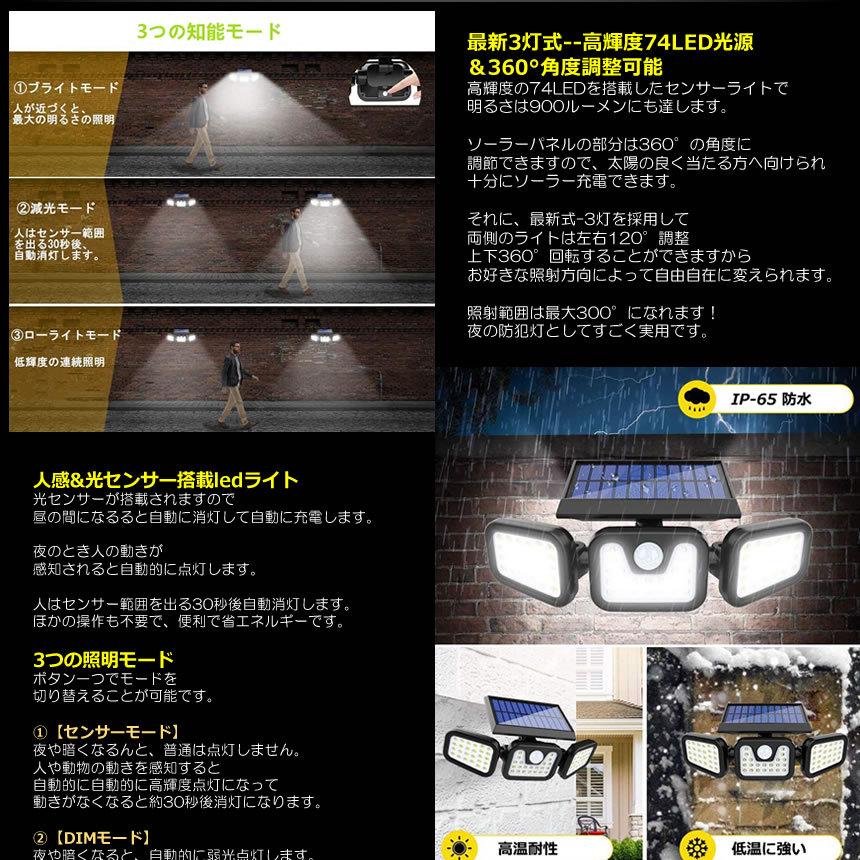 ソーラーライト屋外 センサーライト 3面 74LED 人感センサー 360度 角度調整 モーションセンサー 玄関 防犯 対策 駐車場 庭 広範囲 照射 LEDライト TORILIGT