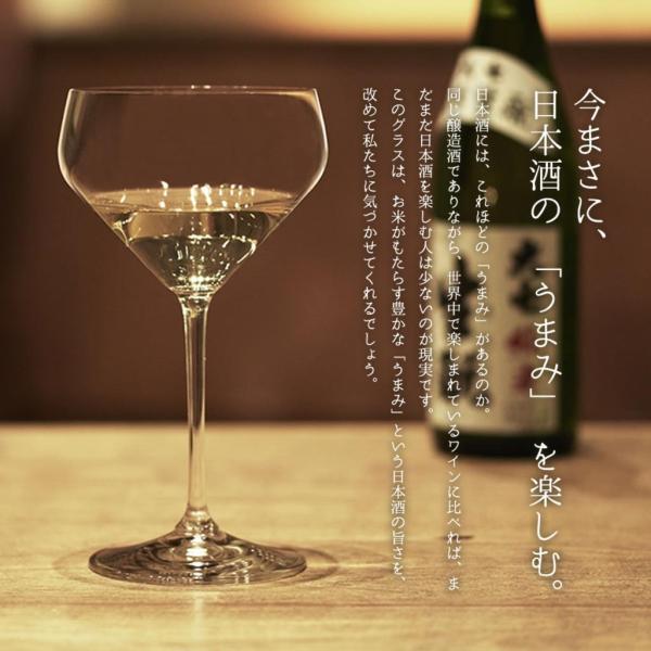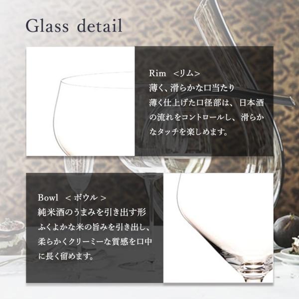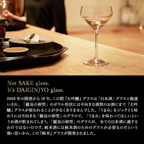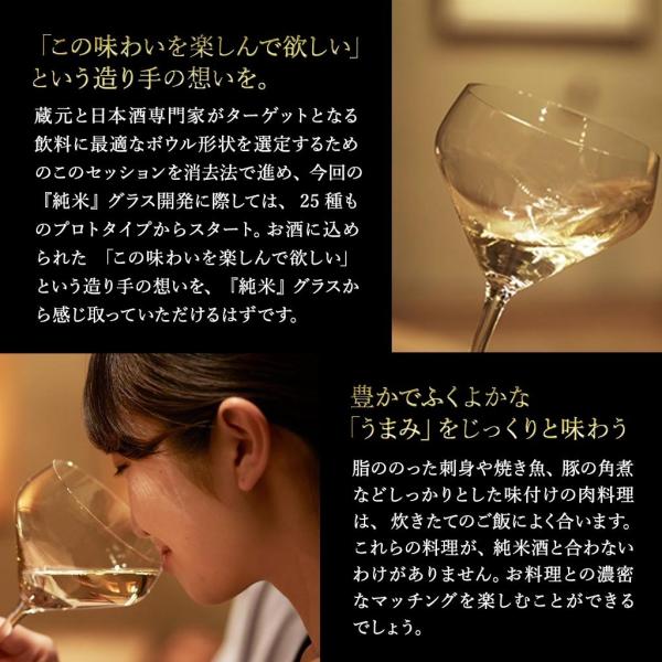 研ぎ澄まされた味わいが魅力の大吟醸酒とは対照的に、 複雑で奥深い旨味が魅力の純米酒のためのグラスは、その香り、 味わいを最大限に引き出すために大ぶりで横長、 飲み口の口径が大きい形状となりました。