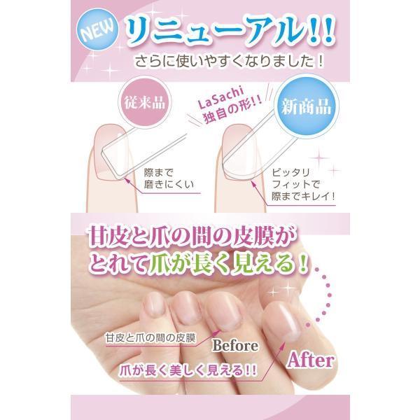 (2)ヤスリの面で磨いて下さい。材質の特性上、縁が当ると爪に細かい傷が出来ることが有ります。