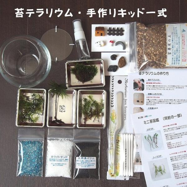 苔をはじめ、ガラス容器や材料・作り方のしおりの必要な材料が一式揃っているので