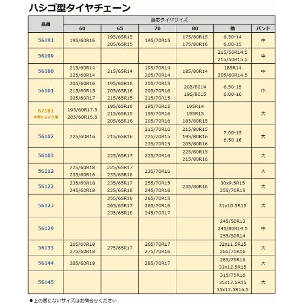 安価で豊富なサイズバリエーション四駆だと過信しての雪道での事故が増加しております。持ってて安心の安価なタイヤチェーンです。チェーン規制のためにもどうぞ!●セット内容:ハシゴ型タイヤチェーン(左右分)、ゴムバンド(左右分)●適合は適合表にてご確認ください。
