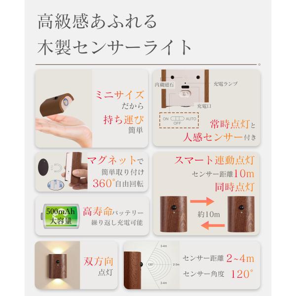 人感センサーライト 連動式 2個セット 室内 玄関 木製 USB充電式 無線連動 LED 照明 廊下 階段 LEDライト おしゃれ 屋内 小型 A125