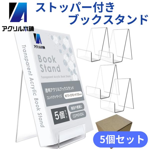 アクリル本舗 ストッパー付き ブックスタンド 5個セット アクリルスタンド ディスプレイスタンド レッジ付き イーゼル 写真 本 書類 CD 同人誌 立て 展示 透明