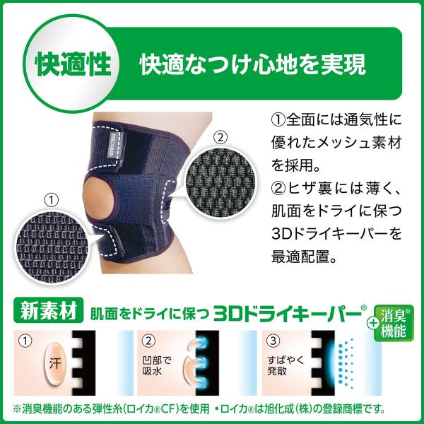 サポーターの内面に肌面をドライに保つ、新素材3Dドライキーパーを採用。立体構造になっており、凸部で撥水、凹部で吸水し、素早く発散します。また消臭機能もあります。※消臭機能のある弾性糸(ロイカ(R)CF)を使用。ロイカ(R)は旭化成(株)の登録商標です。