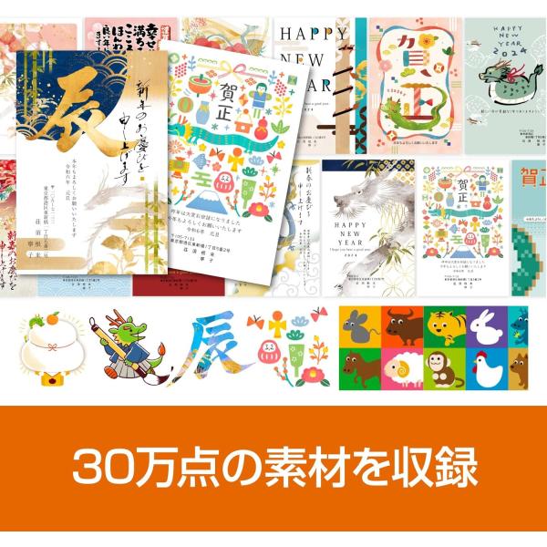 2024年用の辰年デザインや十二支の素材、年中使えるデザインを収録。直感的に選べる「素材パレット」で好みのデザインもすぐ見つかります。