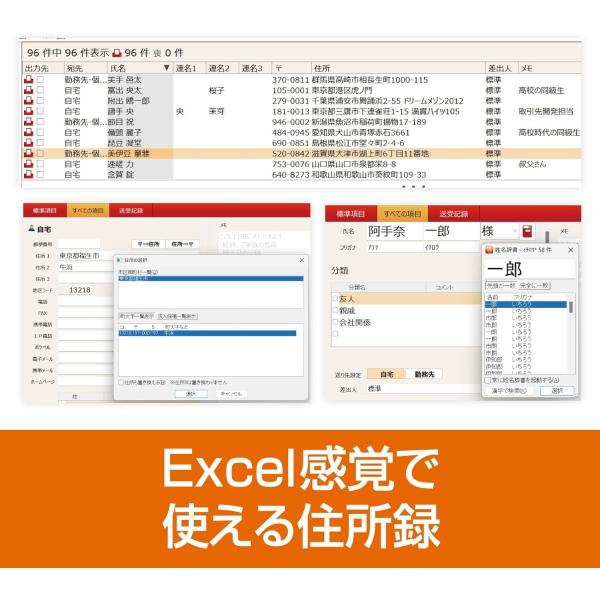 一覧上で直接入力できて、見やすく編集しやすい画面設計。郵便番号から住所入力、年賀状などはがきの送った、もらったを管理できる送受記録など便利な機能を搭載