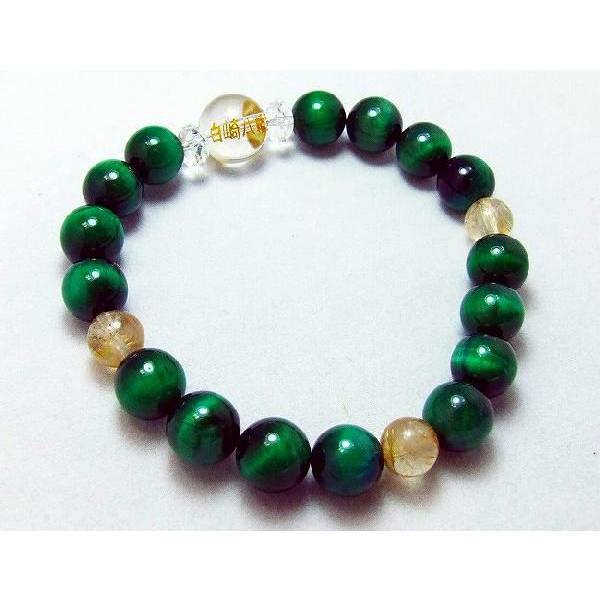 トップに水晶(神璽と白崎八幡宮の印字)金彫りを使用し、邪気祓いの効果があるグリーンタイガーアイと精神力を強化するルチルクォーツを組み合わせた、活力を高める効果のあるブレスレットです。