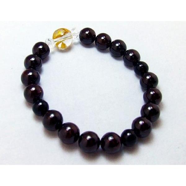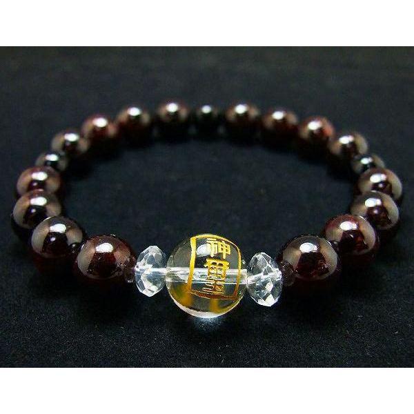 トップに水晶(神璽と白崎八幡宮の印字)金彫りを使用し、ガーネットとオニキスを組み合わせた、精神と肉体の両面から自身を強くし、生命力を高めてくれる効果のあるブレスレットです。