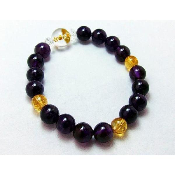トップに水晶(神璽と白崎八幡宮の印字)金彫りを使用し、アメジストとシトリンを組み合わせた、精神と感情面のバランスをとって、幸運体質にさせてくれる効果のあるブレスレットです。