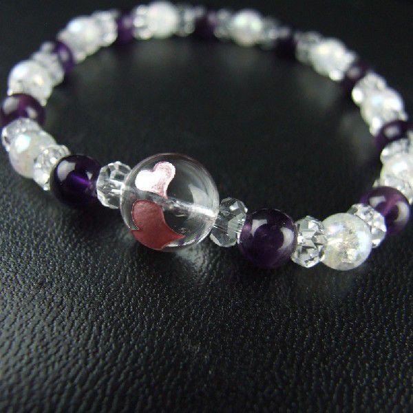 【ブレスレットお守り】ピンクダブルハート水晶10mm×1、アメジスト6mm×10、オーラクラック水晶6mm×9、ボタンカット水晶3×5mm×20 内周約17cm
