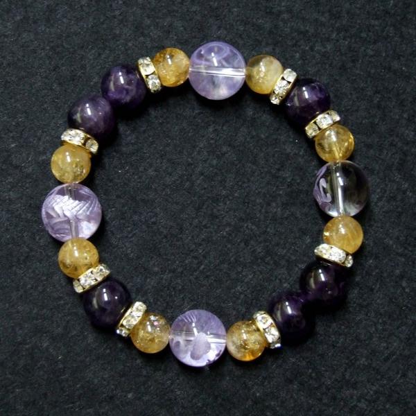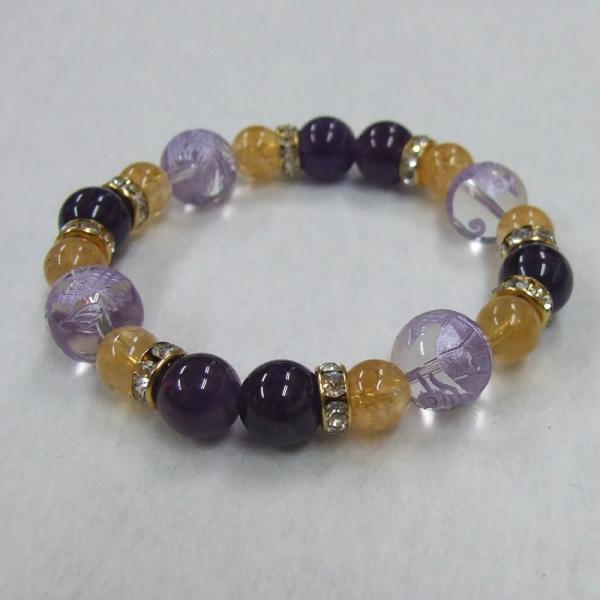 彫刻紫箔水晶の四神(玄武・青龍・朱雀・白虎)を四点・アメジスト・シトリンで結んだ男女兼用サイズのブレスレットです。