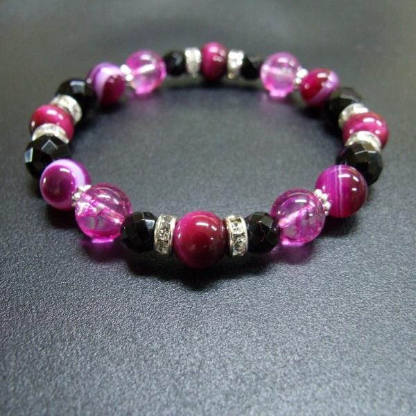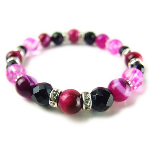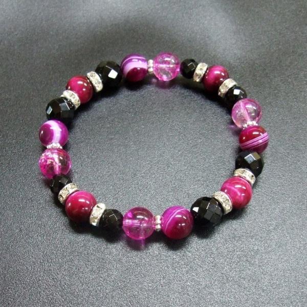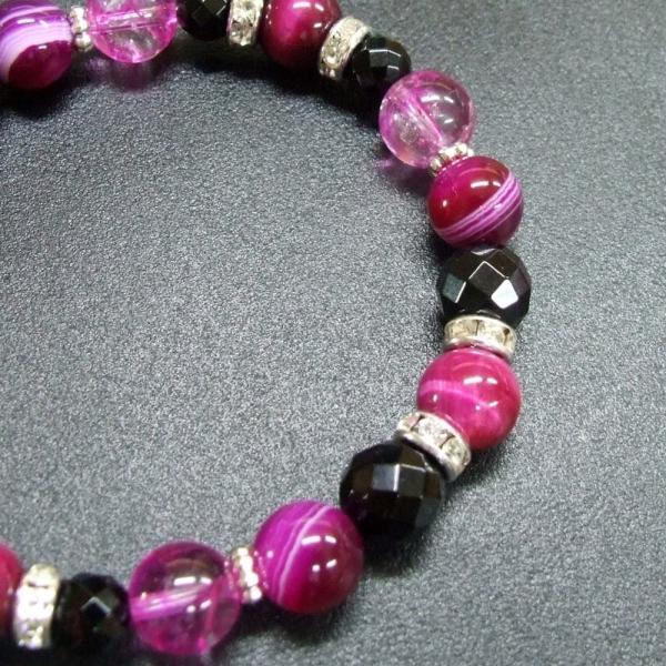 ピンクタイガーアイ8mm×4、ピンクラインアゲート8mm×4、ピンククラック水晶8mm×4、64面カットブラックオニキス8mm×4 6mm×4、ロンデル 内周約14cm(画像)