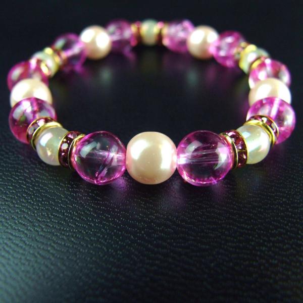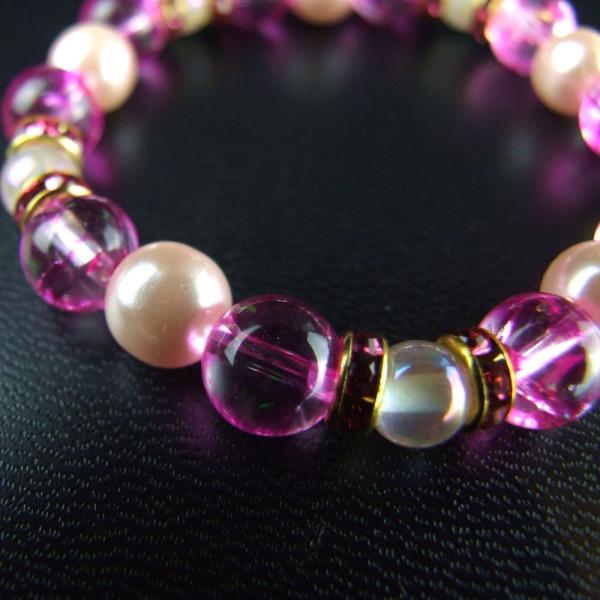 ピンクパール(樹脂)8mm×5、ピンククラック水晶8mm×10、ローズクォーツオーラ6mm×5、ロンデル 内周14.5〜15.0cm