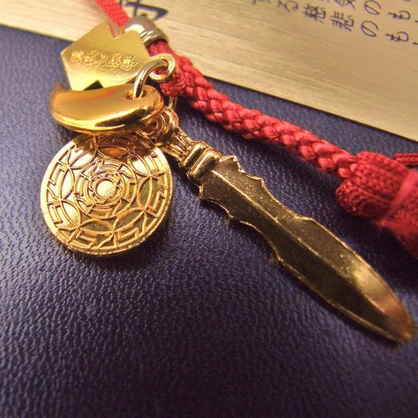 ◆鏡は事の是非善悪がそのまま映るのを徳とする智恵のもと、剣は剛強を徳とする勇気のもと、玉は柔和を徳とする慈悲のもと。この三種の神器が付いたストラップタイプのお守りです。