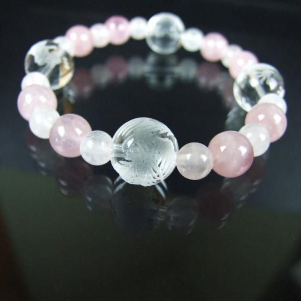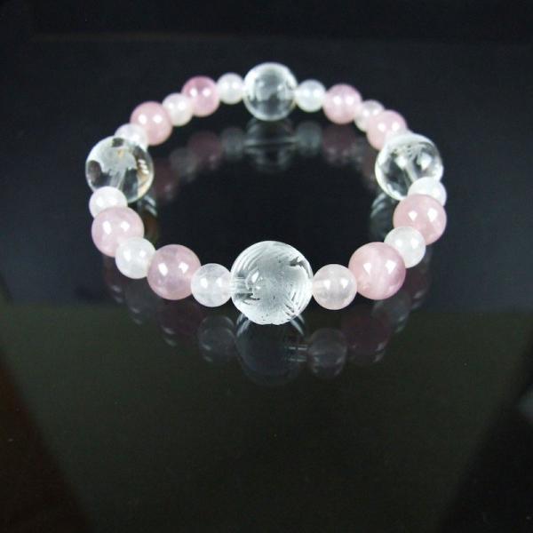彫刻水晶の四神(玄武・青龍・朱雀・白虎)を四点に置き、ローズクォーツで結んだ、女性用ブレスレットです