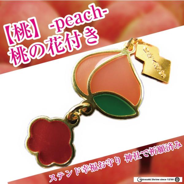 ■ステンドタイプの奉製で桃を模った根付お守りです。ケータイやお財布、鞄などに付けてお持ちください。