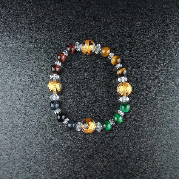 彫刻水晶の四神(玄武・青龍・朱雀・白虎)を四点に置き、タイガーアイ(四種)で結んだ、男女兼用サイズのブレスレットです。