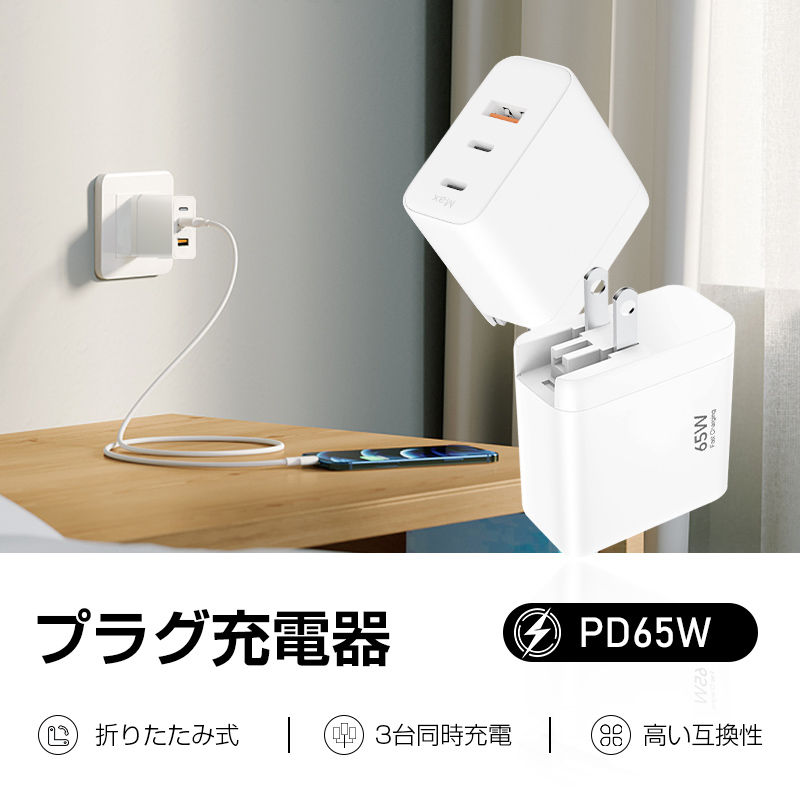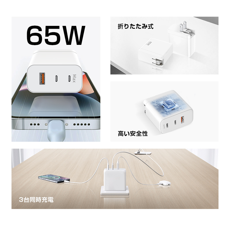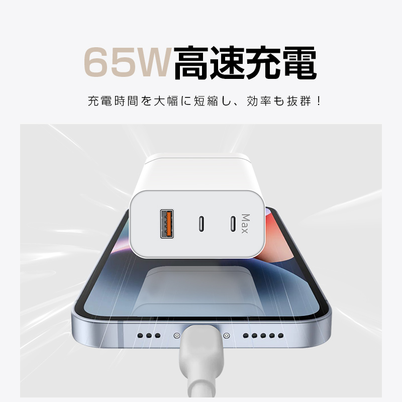 本製品は、最新のGaN技術を採用した高性能充電器です。従来のシリコン製よりも放熱性と電力変換効率に優れ、より小型・軽量でありながら、最大65Wの高出力を実現します。