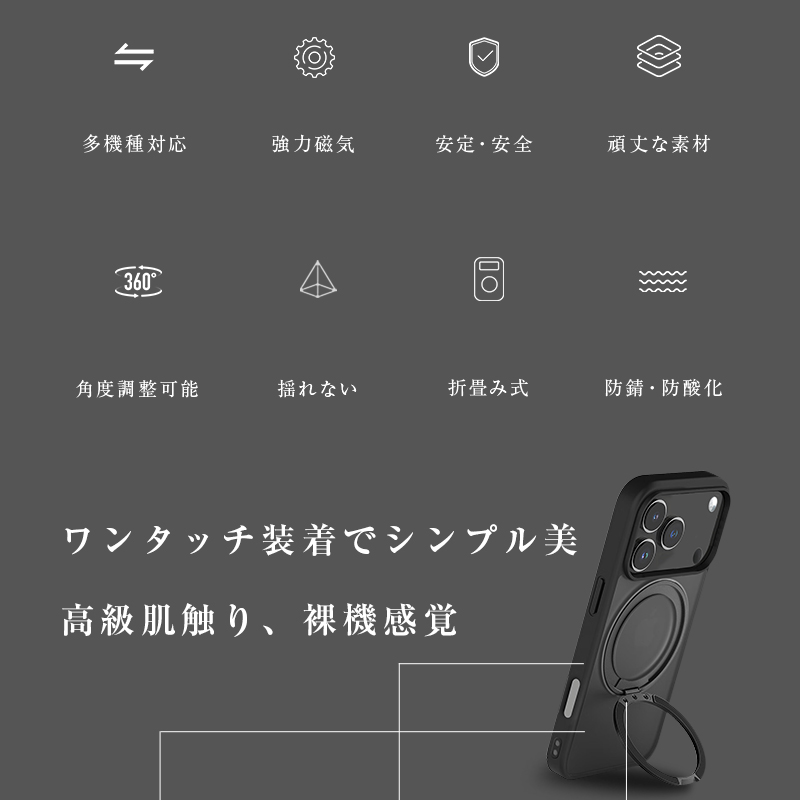 素材:シリコン(辺縁部)+ポリカーボネート(背面)+磁石+合金(スタンド)