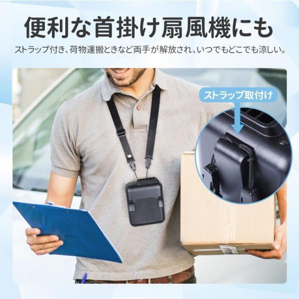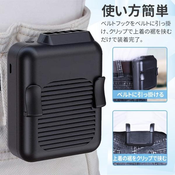 ベルトに取付けてシャツの裾をクリップで挟んだら、服内に風を送り込めます。付属のストラップをつけば首にも引っ掛けられるので両手が解放され、使い勝手は良い。