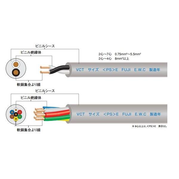 富士電線工業 VCT 8sq×4芯 3m (切り売り) 8mm 4心 ビニルキャブタイヤケーブル (600V耐圧) VCT-8-4C-3m (15204240)