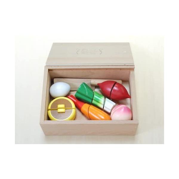 木箱の中に、包丁・まな板の他にミニ食材が6種類入ったおままごとセット。