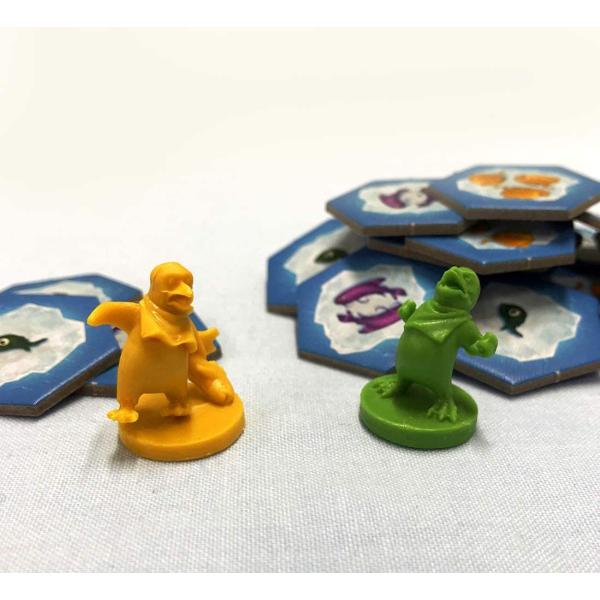 (1)六角形のタイルに魚が1〜3描かれたタイルを敷き詰めて並べ、タイルの上にペンギンのコマを配置します。