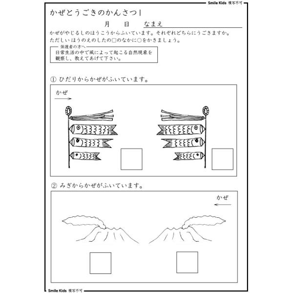 風の動きの観察は日常生活で体験できる自然現象を理解することで将来の理科や発想力につながります。また、合理性について判断できる練習になります。