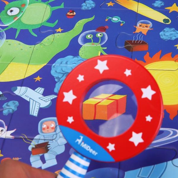 まずはカラフルで物語性のあるイラストのパズルを完成させ、完成後は付属の虫眼鏡を使って、絵の中に隠されたアイテムを探すミッケ遊びを楽しめます。