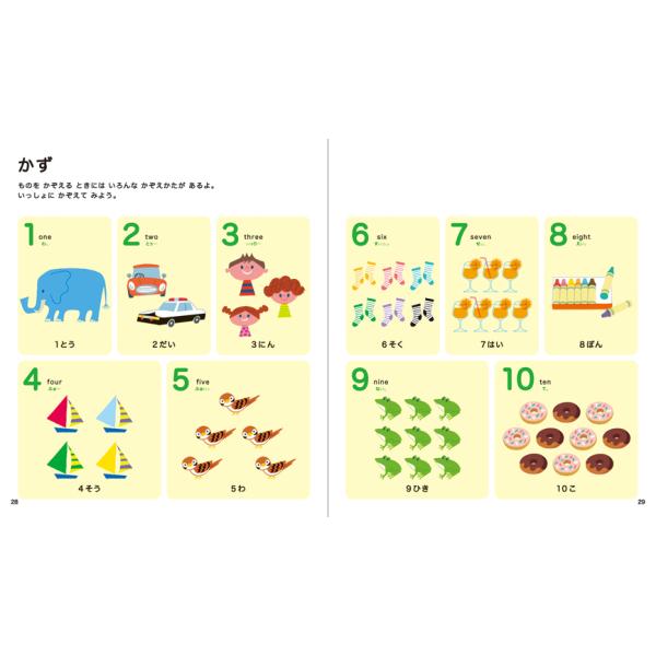 「あいうえお」「1から10」「ABC」といった基礎知識も楽しく学べる、ものの名前ファーストブックです。
