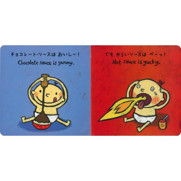 おいしいもの、まずいもの。食べていいもの、だめなものを見開きページでYummy !(おいしー!)! Yucky!(べーっ!)とリズミカルに教える、