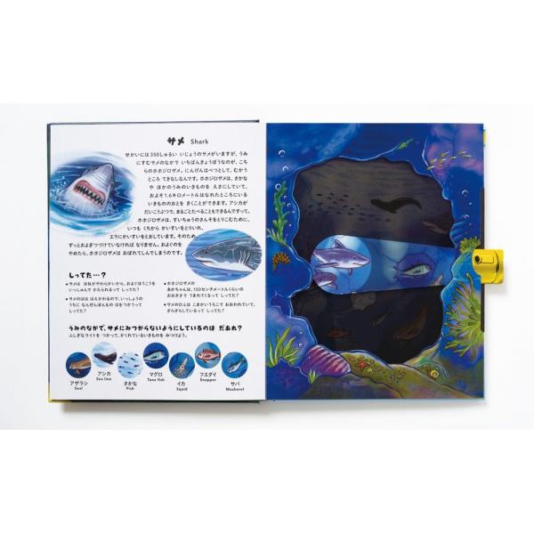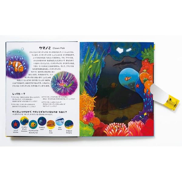 ライトを動かすと、海の中に隠れたいきものが浮かび上がる、しかけ絵本。
