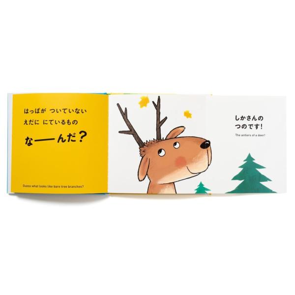 「な〜んだ?」のかけ声とともに仕掛けをめくると、「えだ」が「シカの角」に、「きのこのかさ」が「てんとう虫の体」に変身!