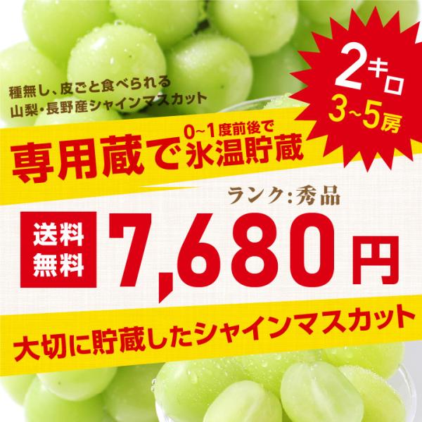 シャインマスカット ギフト 秀品 2kg 3〜5房 山梨・長野産 大房のみを厳選 氷温貯蔵 -S11T 種なし 皮ごと 高糖度 ぶどう お歳暮 お年賀 送料無料 爆買