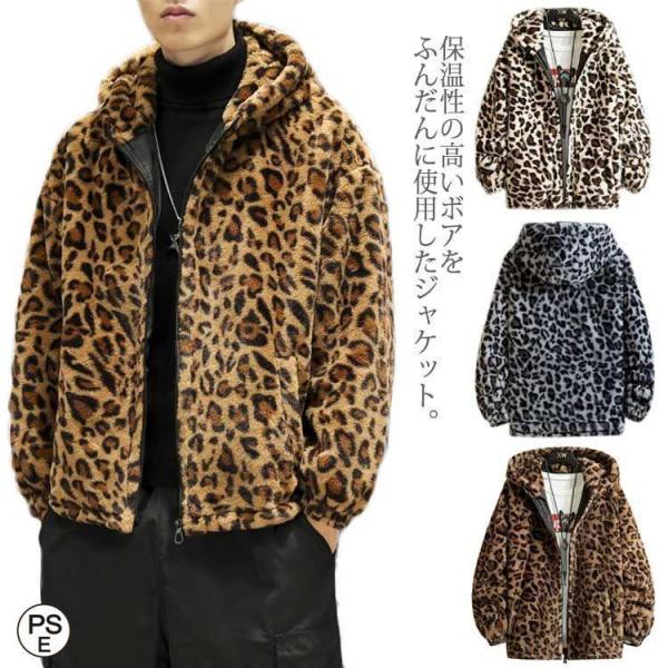 メンズ フード付き ブルゾン ムートンジャケット ヒョウ柄 メンズジャケット ボアジャケット レオパード柄 ムートンジャケット ジップアップブルゾン 厚手 パー