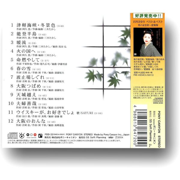 01津軽海峡冬景色02能登半島03暖流04火の国へ05命燃やして06春の雪07波止場しぐれ08大阪つばめ09天城越え10夫婦善哉11ウィスキーが、お好きでしょ 唄:SAYURI12大阪のおんな