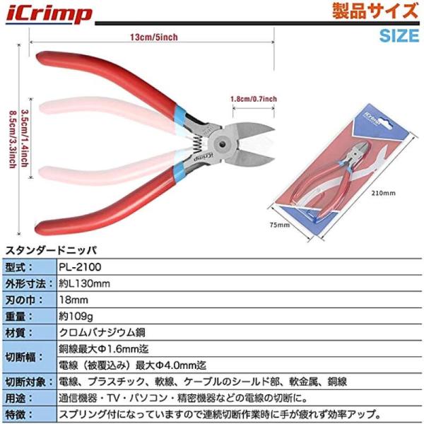 ニッパー 工具 スタンダードニッパー バネ付 フラッシュニッパー 標準ニッパー 切断工具 アイクリンプ iCrimp 電線外径φ4mm迄 銅線等軟線用 PL-2100 メール便