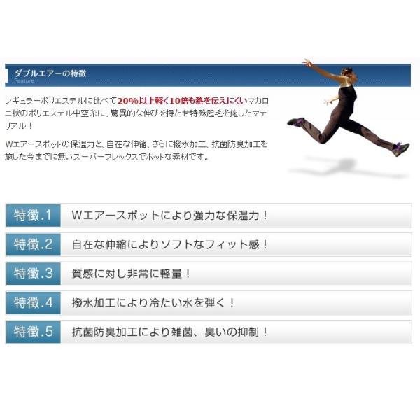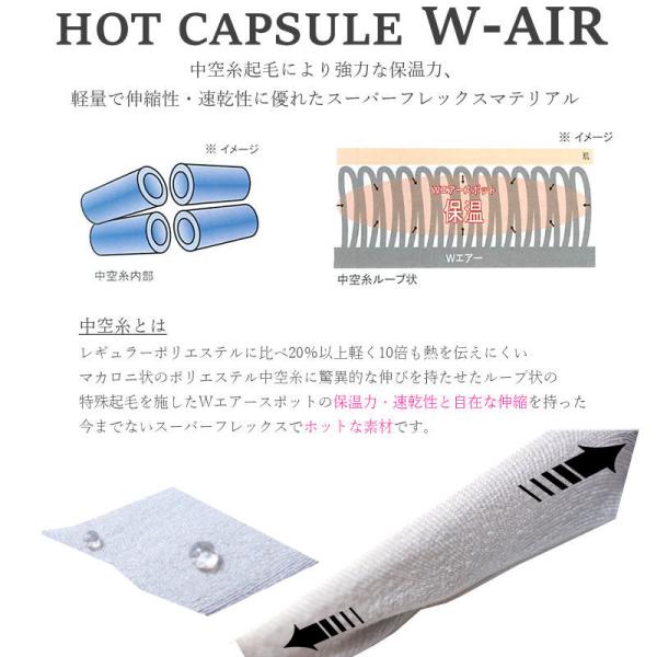 レギュラーポリエステルに比べて20%以上軽く10倍も熱を伝えにくいマカロニ状のポリエステル中空糸に、驚異的な伸びを持たせ特殊起毛を施したマテリアル! Wエアースポットの保温力と、自在な伸縮、さらに撥水加工、抗菌防臭加工を施した今までに無いスーパーフレックスでホットな素材です。