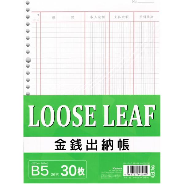 [日本製] ルーズリーフ 金銭出納帳 B5 26穴 30枚 (1パック)
