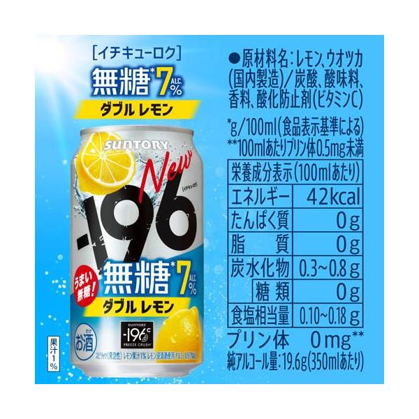 -196 イチキューロク 無糖 ダブルレモン 7%/アルコール飲料/( 無糖 甘くない レモンサワー 缶チューハイ )/【発売元、製造元、輸入元又は販売元】サントリー/・単品JAN:4901777393998/【-196 イチキューロク 無糖 ダブルレモン 7%の商品詳細】●強い「冷涼感」&「果実感」が人気の-196度シリーズから「本当に美味しくて甘くないチューハイ」。●一気にリフレッシュモードに切り替えできる瞬間凍結をベースに「冷涼感」と「果実感」を表現したデザインです。●甘くないのに、果実そのものの骨太な美味しさで満足できる時代にあった価値を提供するチューハイに仕上がっています。●アルコール度数:7.0%/cate60990