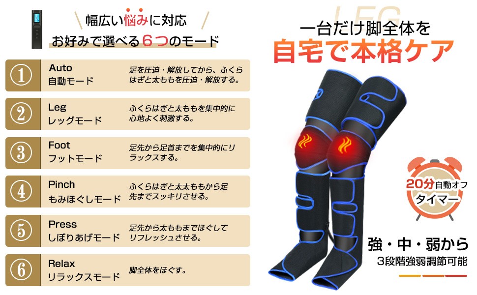 6種類のモードと3段階の強さで好みに合わせて調整可能。脚のケアを中心にした脚マッサージ器としても、足裏を重点的にケアしたい方の足マッサージ機 足裏としても活躍します。膝には35℃・45℃・55℃のヒーターを搭載し、冷えやすい部分をやさしく温めます。
